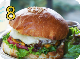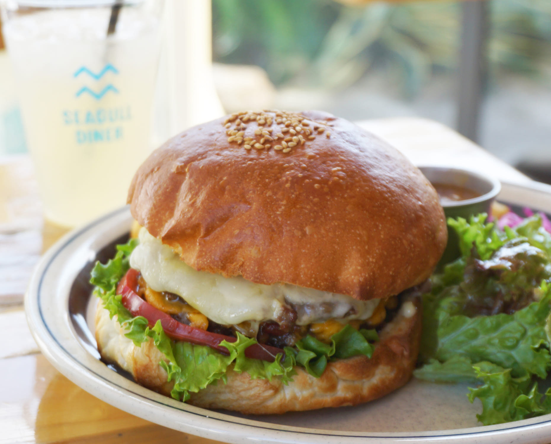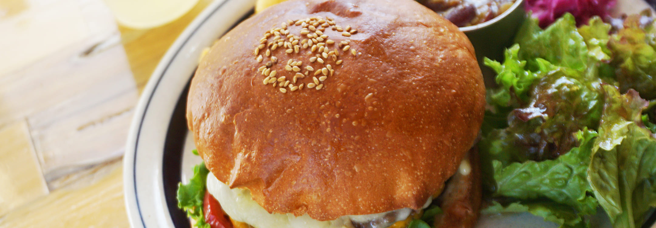 イチオシのメニューは「スペシャルバーガー」パティもチーズもダブルというボリューム感ですが、添えられたブラックチリソースで味の変化を楽しみながら、あっという間にたいらげることができるはず。チーズはモッツァレラとチェダーの2種類を使っています。たっぷりサラダが付いているのも嬉しいポイント。