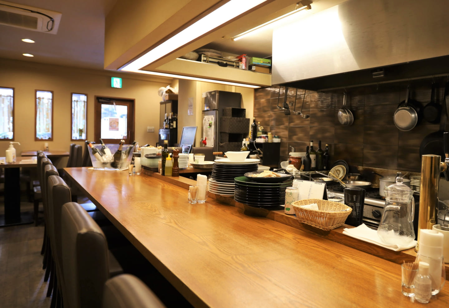 アットホームな空間で本格イタリアンを味わえるとあって、地元客にも人気のお店です。カウンターメインの落ち着いた店内がくつろぎ感を演出します。