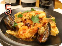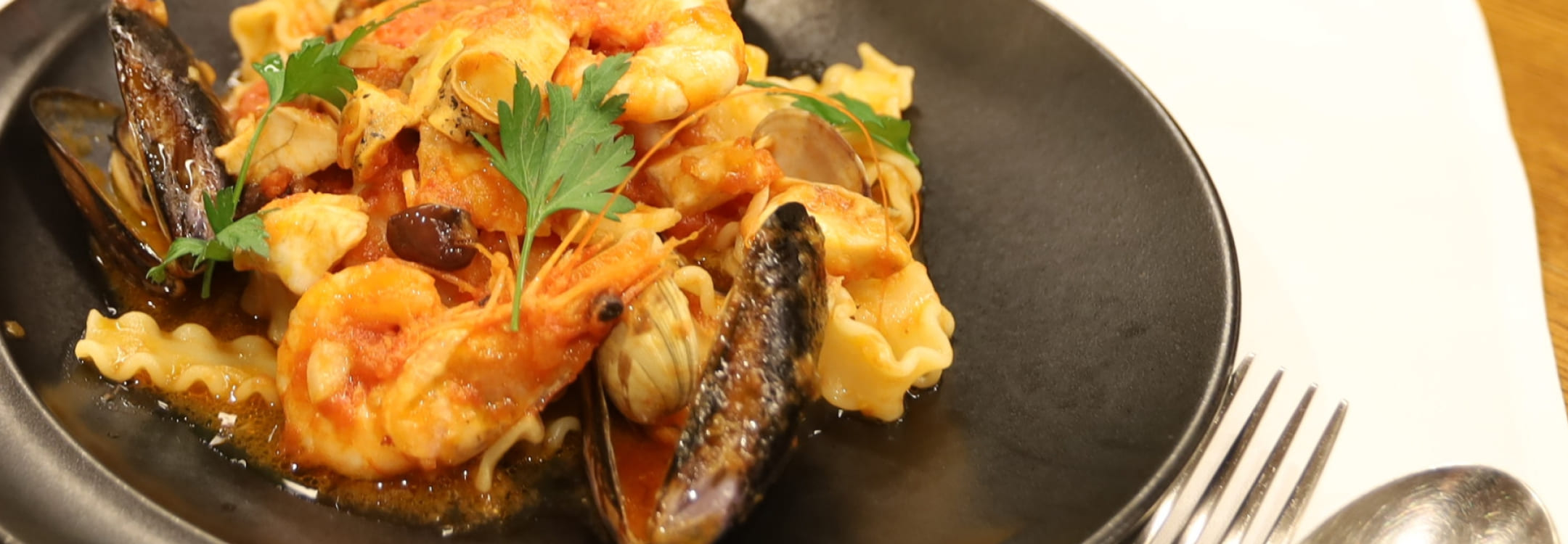 今回巡りあったディナー料理は「魚介たっぷり マファルディーネ ペスカトーレ」。ぜいたくに使われた魚介の味わいと、具材に絡むコクのあるソースが五感を満たしてくれます。料理に合うワインもアドバイスしてくれるそう。
