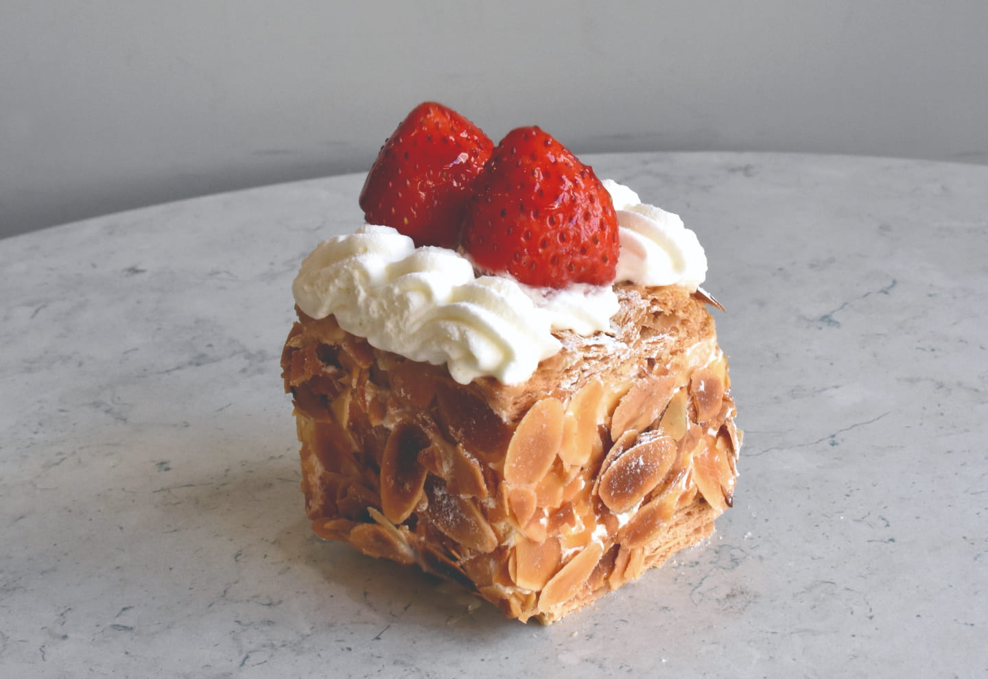 デザートの中で人気が高いのは季節のフルーツが乗ったナポレオンパイ。艶々のフルーツと牛乳を使わずに仕上げた濃厚なカスタードクリームの味わいをお好みのドリンクと一緒に味わえば、ますますパリのカフェにいるような気分になります。