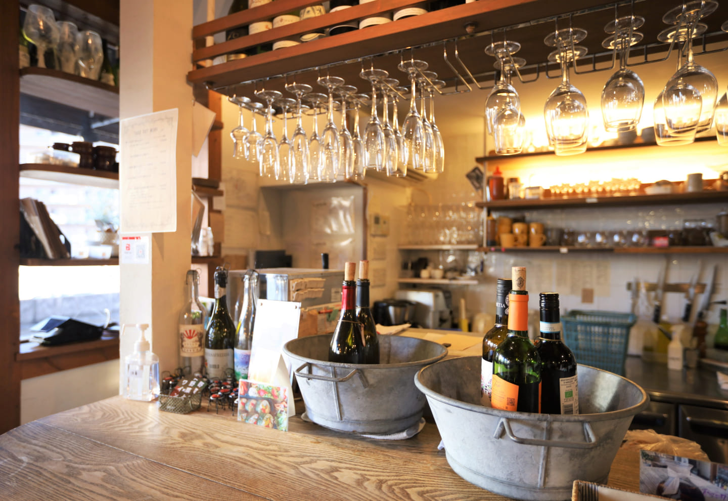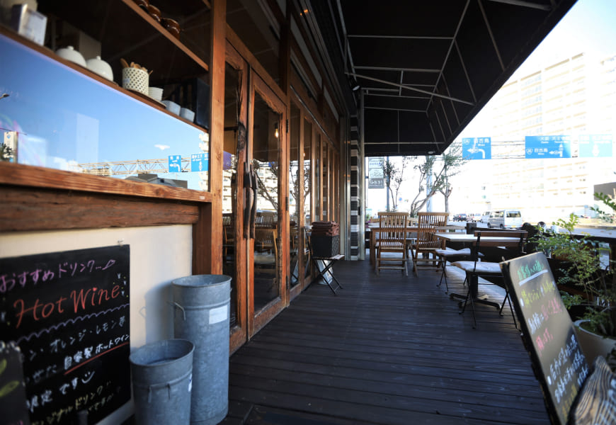 最寄り駅すぐというアクセスの良さから、遠方より訪れるお客さんも。テラス席を備えているためワンちゃん連れもOKです。カウンター席で食事やワインを楽しむおひとり様もいるなど、さまざまな使い方ができるところも魅力的。